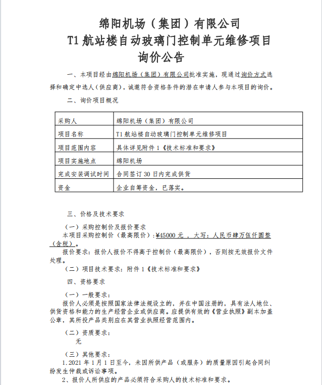 綿陽機(jī)場(chǎng)(集團(tuán))有限公司 T1航站樓自動(dòng)玻璃門控制單元維修項(xiàng)目詢價(jià)公告