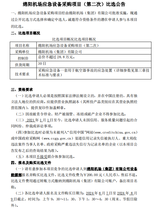 綿陽機(jī)場(chǎng)應(yīng)急設(shè)備采購項(xiàng)目(第二次)比選公告