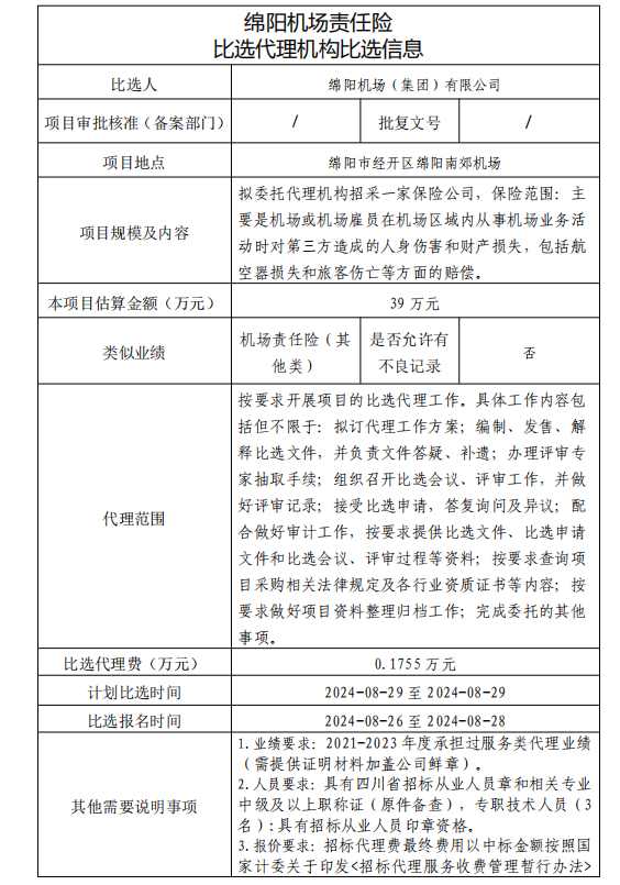 綿陽機場責(zé)任險 比選代理機構(gòu)比選信息